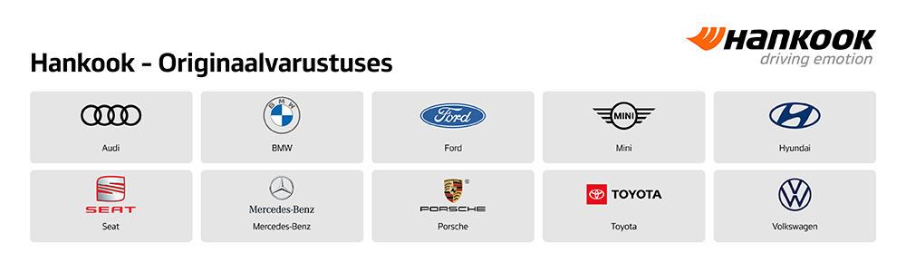 Hankook rehvid kuuluvad originaalvarustusse paljude tuntud autotootjate poolt, nagu näiteks: Audi, BMW, Porsche, MINI, Renault, Seat, Fiat jpt.